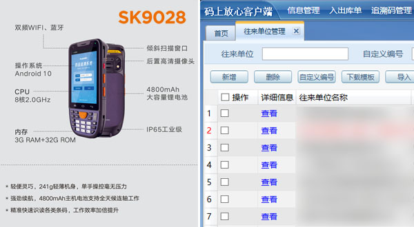 以销邦SK9028扫码枪为例,出厂时预装有“药监通”APP,可直接从“码上放心”客户端导入“往来单位”和“药品信息”。随后,再通过扫描枪扫描追溯码,将采集到的数据信息,通过无线方式上传到“码上放心”平台即可,操作简便。