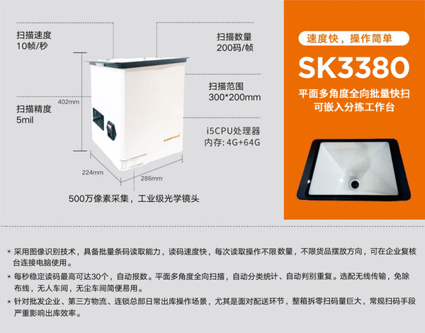 销邦SK3380批量扫码平台,采用图像识别技术,读码速度快,每秒稳定读码最高可达30,自动报数,每次读取操作不限数量,不限货品摆放方向,可在企业复核台连接电脑使用。能够高效、准确地读取药品包装上的追溯码或商品码。