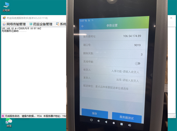 2、在电脑上打开“药监助手”客户端软件,在一体机上打开药品追溯APP,点击“系统设置”,将两者IP地址设为相同,完成系统无线配对。