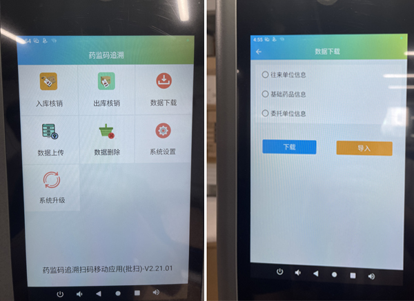 3、在一体机的药品追溯APP中,点击“数据下载”,选择“往来单位信息”和“基础药品信息”下载,将基础数据导入设备。