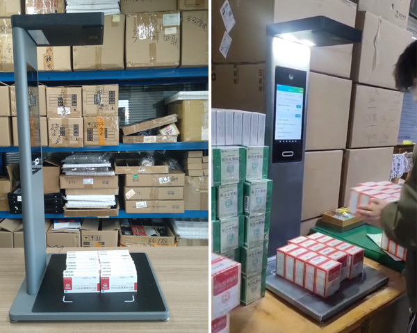 4、准备工作完成后,即可开展扫码操作。把多盒药品整齐放置在一体机的扫码区域,设备会自动读取追溯码信息,并语音报数,屏幕上可查看已扫描的数量和药品信息。
