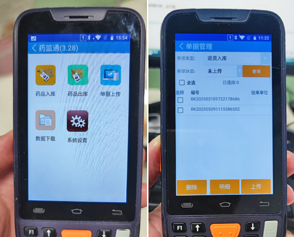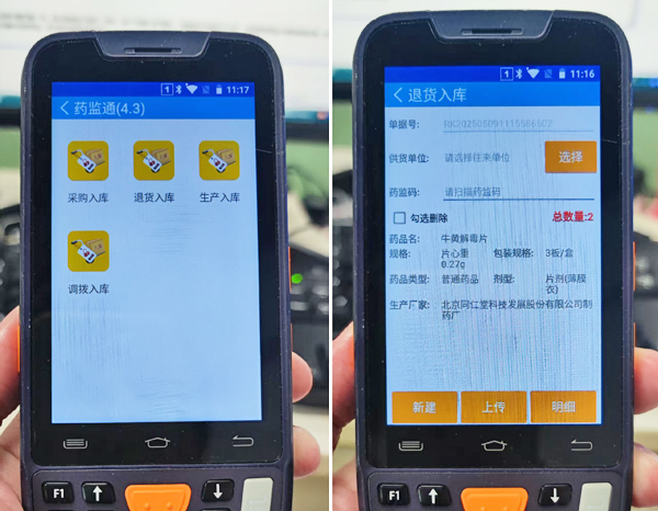 PDA扫码枪上打开“药监通”软件,点击进入“药品入库”>“退货入库”模块,用PDA扫码枪依次扫描采集需退货药品追溯码。