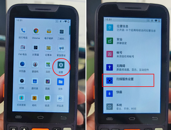 PDA扫码枪上点击“设置”,向上滑动,找到“扫描服务设置”,早期设备叫“扫描设置”。